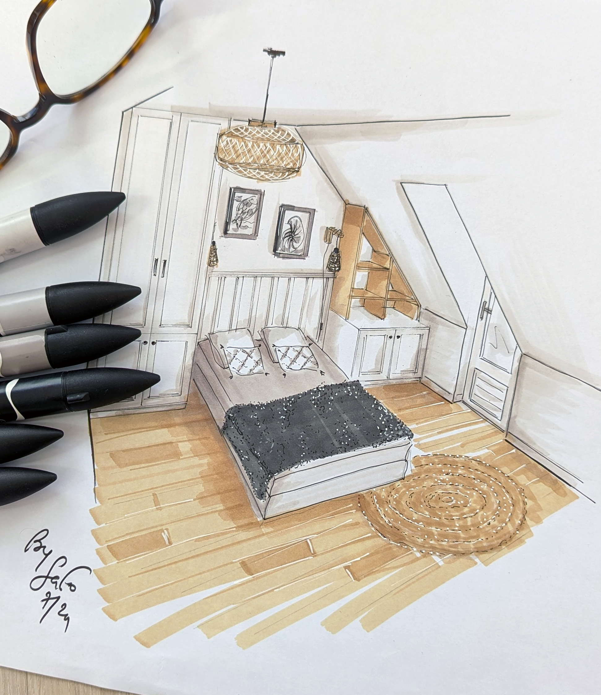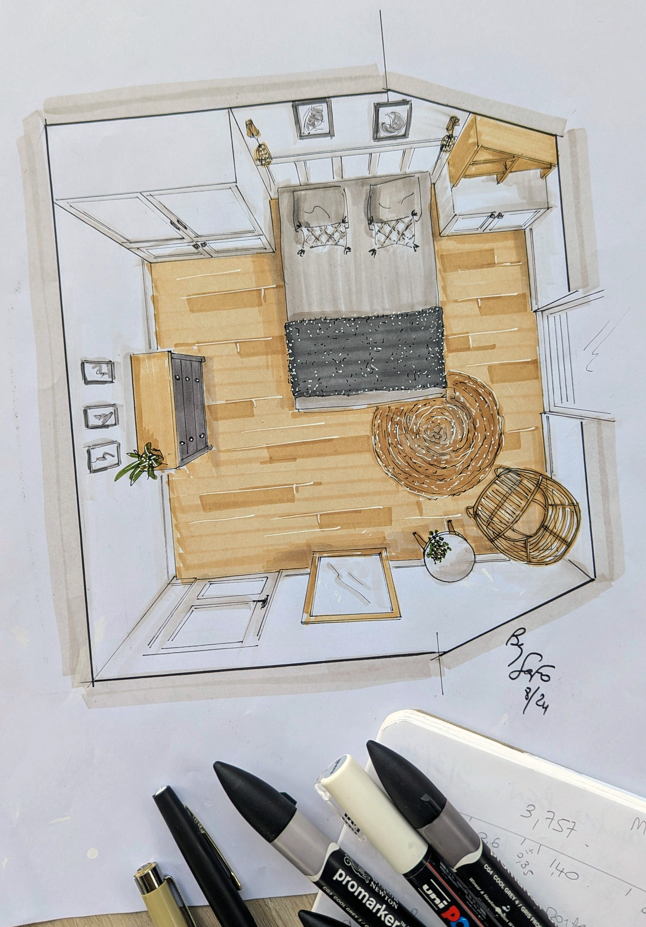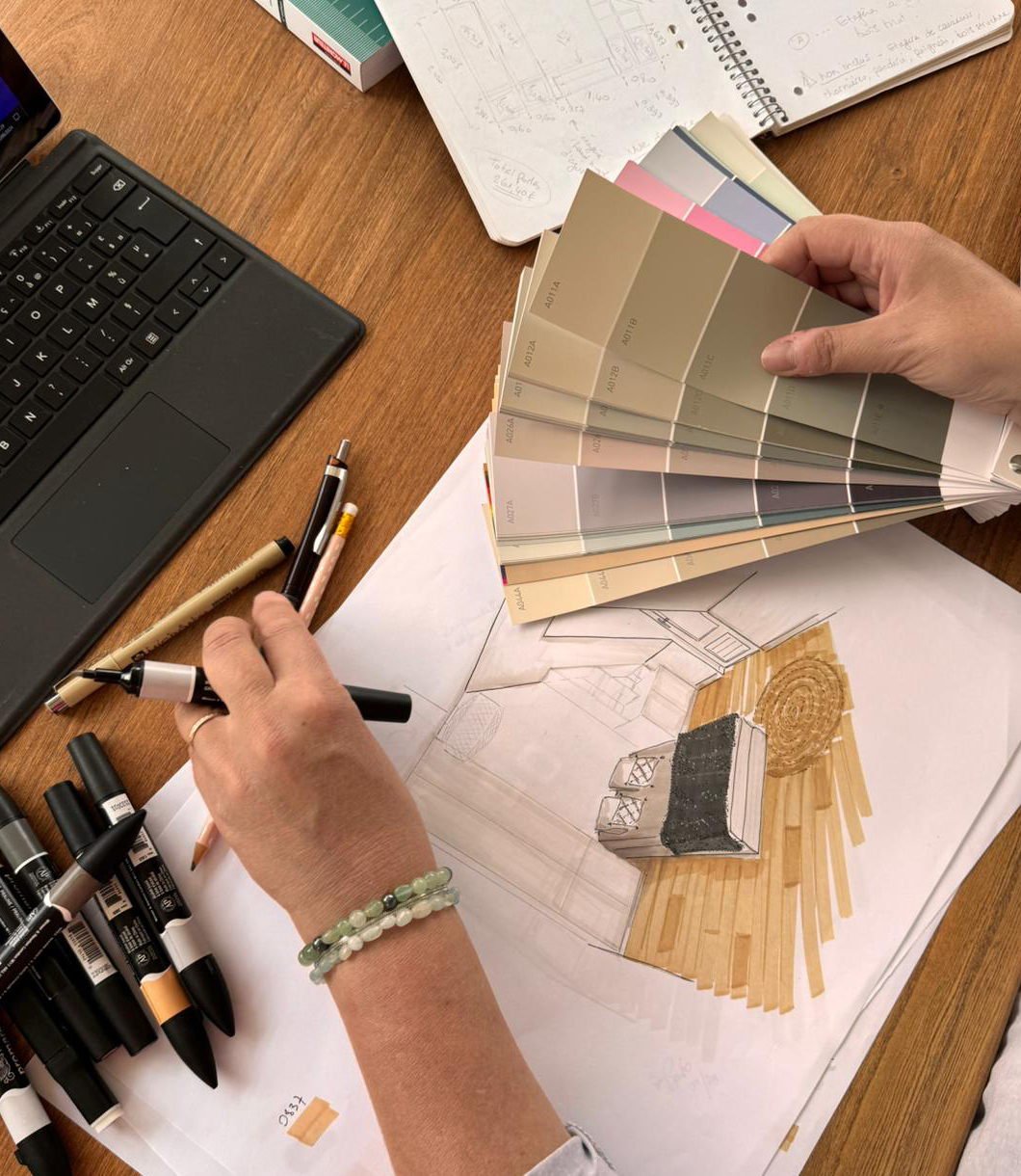 J’utilise le croquis à la main comme un véritable outil d’accompagnement. C’est ma façon d’exprimer une ambiance, d’imaginer les volumes, de traduire vos envies avec sensibilité.
