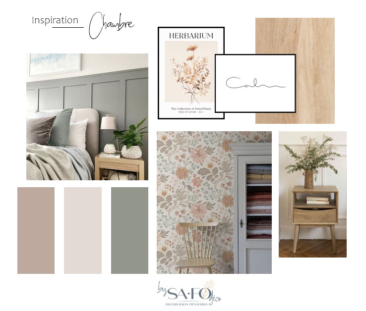 Avril 2023 – Planche Inspiration qui a permis à ma cliente de valider le style et les couleurs pour sa chambre