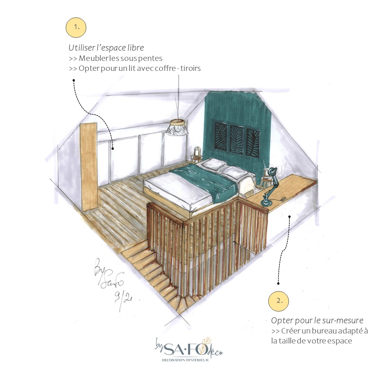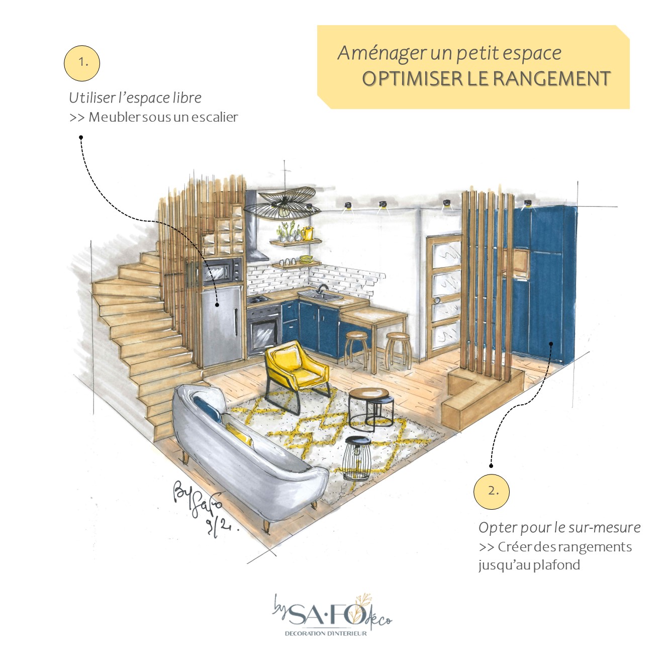 Conseil Nr 1 > on utilise l’espace vide : en meublant sous un escalier avec une cuisine, par exemple, ou encore en meublant le bas des sous pentes. On ajoute des étagères dans tous les renfoncements. On opte pour un lit avec des tiroirs, coffres.